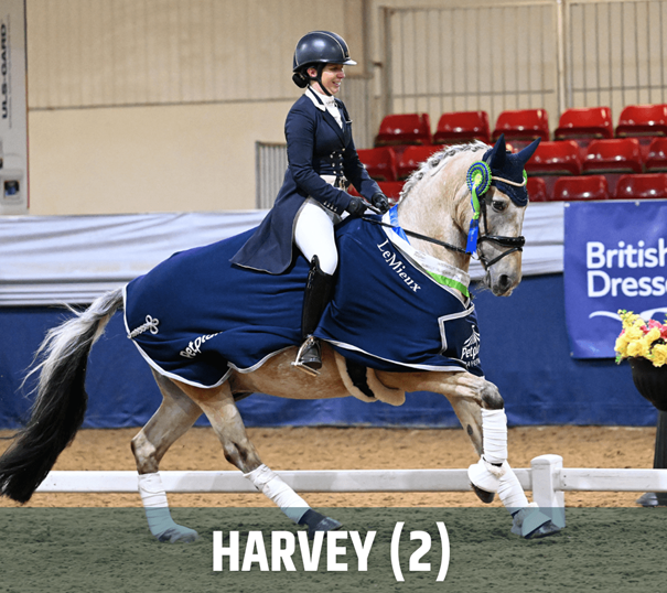 „Harvey je patnáctiletý, dvacetiletý valach plemene Appaloosa x Welsh D, který soutěží v drezuře na úrovni Grand Prix. Historicky měl skutečné problémy se střevy a vředy a v roce 2020 mu byly diagnostikovány vředy G4. Od té doby jsem byl extrémně opatrný s jeho krmením a životním stylem, ale i přes četné doplňky stravy jsem vždy zjistil, že při ježdění může mít záchvaty nevyzpytatelného chování a měl tendenci chodit do boxu tak silně, že v jeho podestýlce byly vidět stopy.“